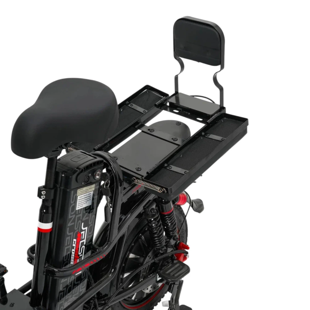 Рама выполнена из стали, что обеспечивает высокую прочность и надёжность, особенно при активной городской эксплуатации и перевозке тяжёлых грузов. Размер рамы составляет около 120 см, а конструкция рулевой колонки – резьбовая, что упрощает обслуживание и регулировку. Вилка пружинно‑масляная, она хорошо сглаживает мелкие неровности асфальта и обеспечивает комфортную езду по городским дорогам и тротуарам. Колёса диаметром 16 дюймов сбалансированы между манёвренностью и устойчивостью, а классические педали позволяют использовать велосипед и в обычном (не только электрическом) режиме.